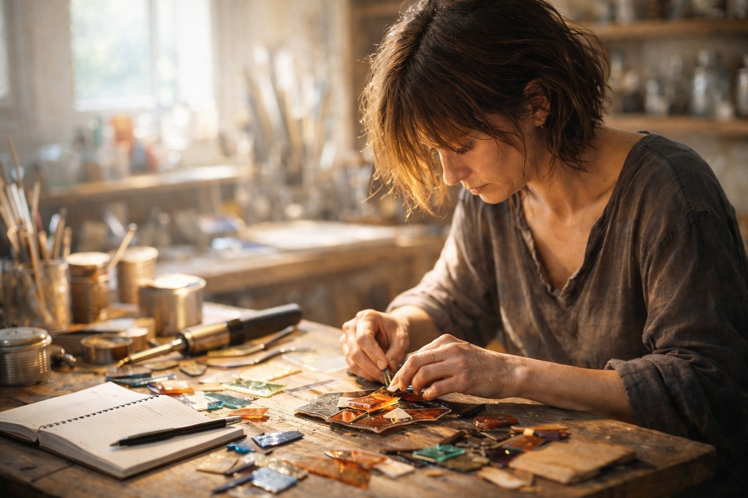 An introduction to stained glass art, where participants learn the basics of cutting, assembling, and joining glass pieces to create a finished decorative piece. Suitable for Beginners • glass lovers • anyone interested in traditional glass art